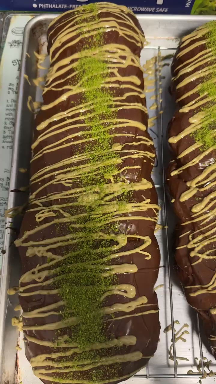 Tsoureki filled with Dubai chocolate pistachio kateifi, topped with dark chocolate and papi pistachio cream , pistachio crumb. LIMITED EDITION TO 2025