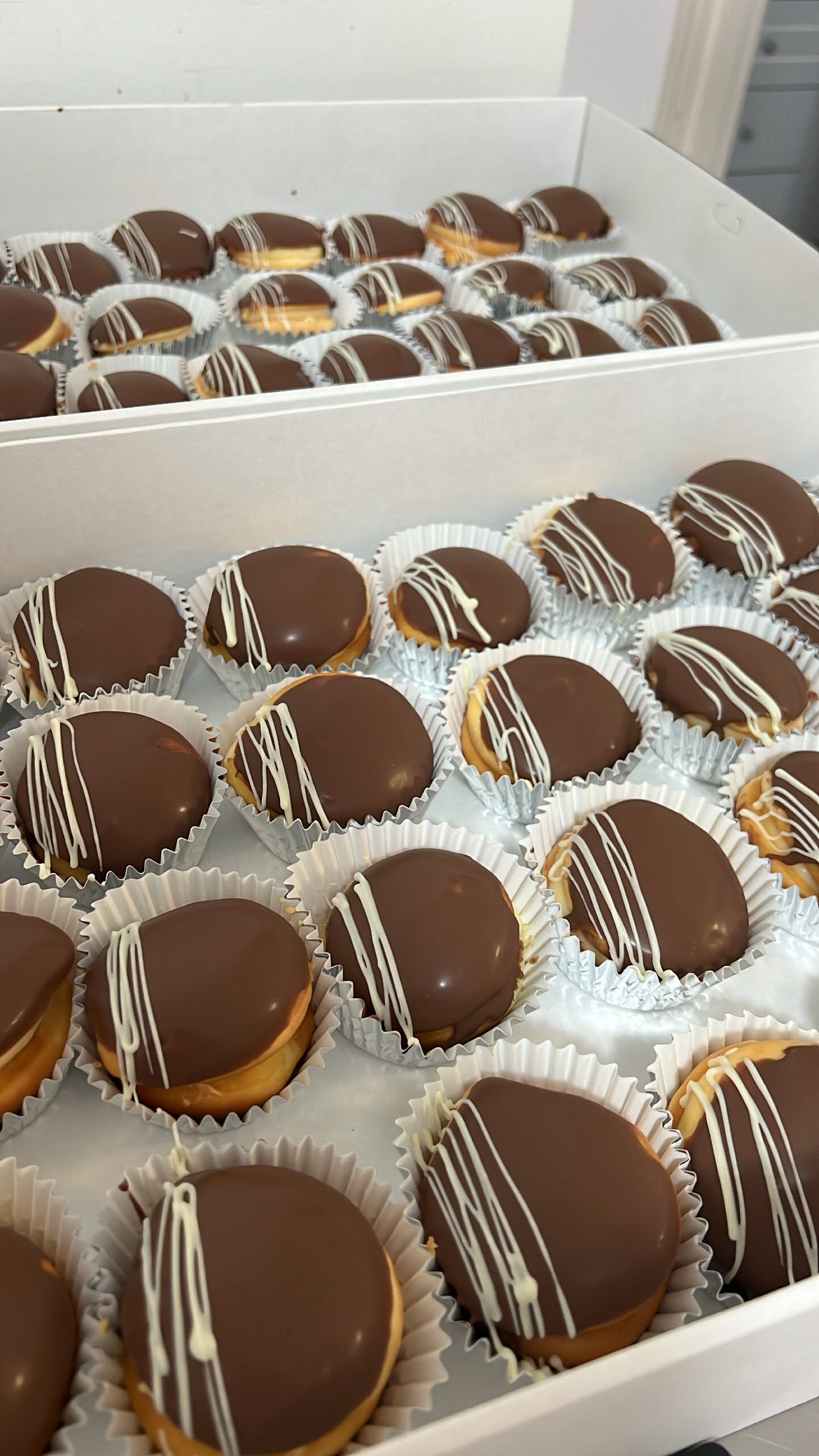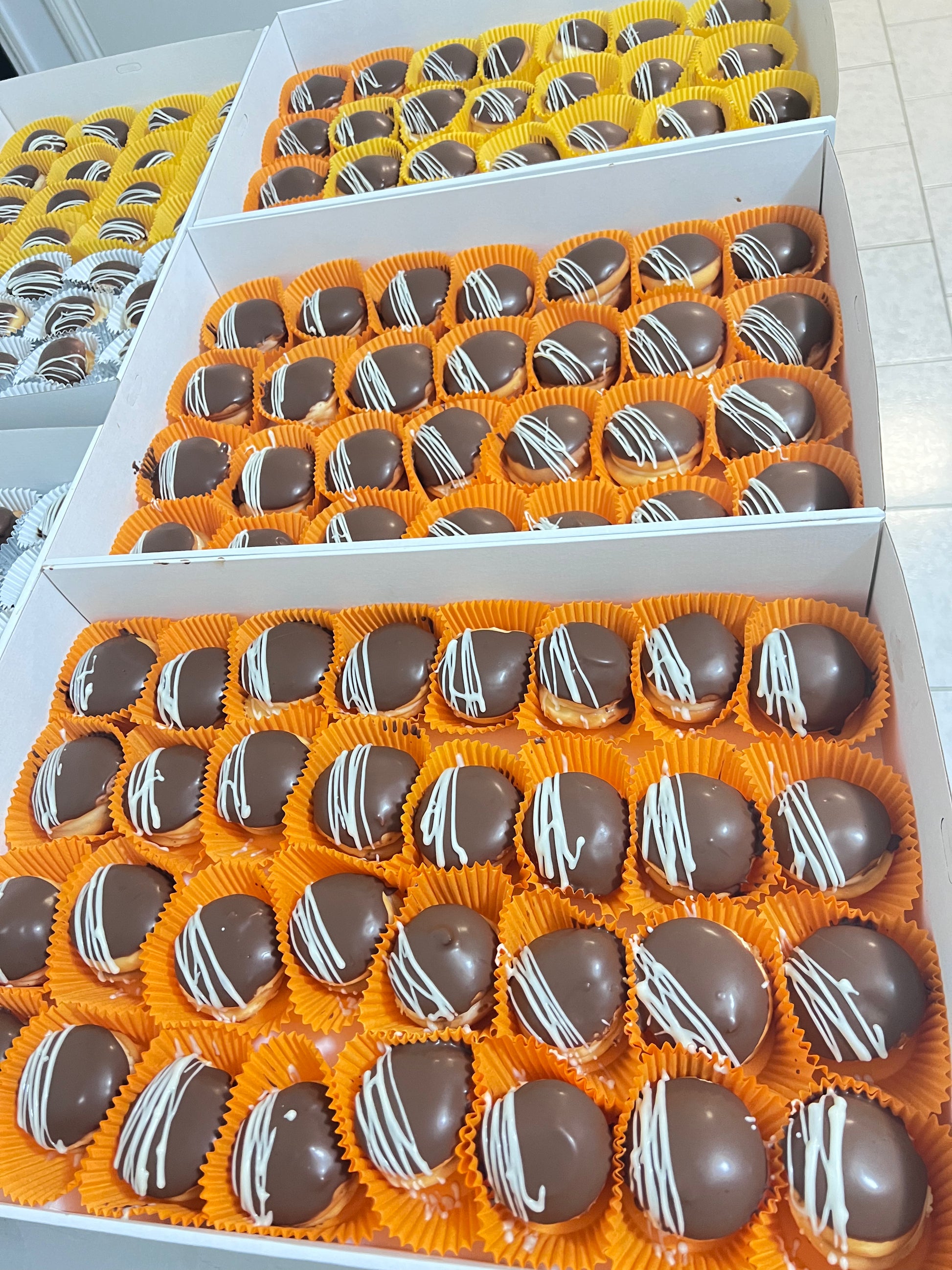Two sponges, sandwiched together with pastry cream, top dipped in chocolate. Box of 12