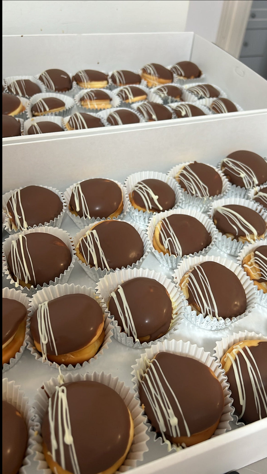 Two sponges, sandwiched together with pastry cream, top dipped in chocolate. Box of 12