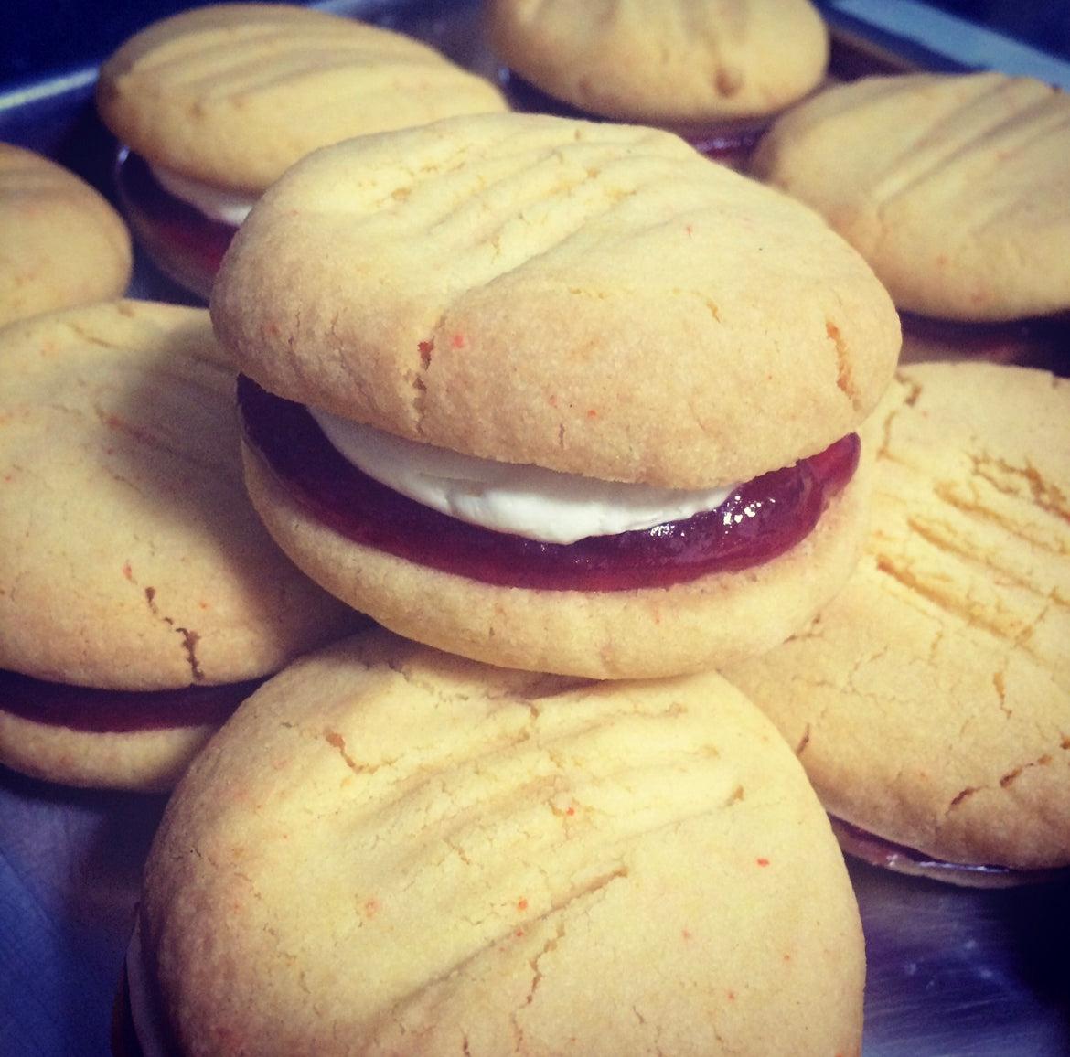 Buttery shortbread filled with raspberry jam and vanilla buttercream. Box of 12