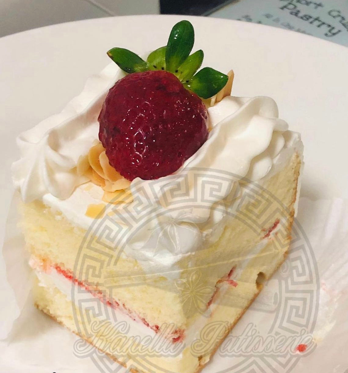 fluffy vanilla sponge filled with fresh cream and raspberry preserve, fresh strawberry and toasted almond flakes.
