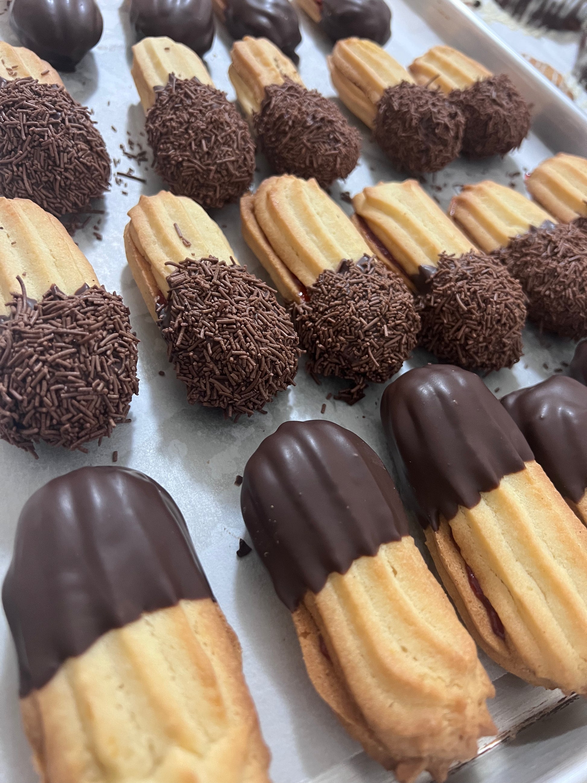 Buttery shortbreads, sandwiched with raspberry jam and coated with chocolate. Box of 12